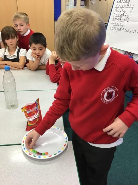 For our first experiment, we put a gummy bears in a test tube of water. In one test tube we added warm water and in the other cold and we observed what happened to the bear. The next experiment, we placed skittles in a bowl with water and watched what happened. In our final experiment, we created our own volcano using vinegar, food colouring and bicarbonate of soda!