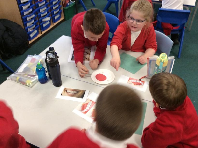 After studying the function of teeth, Year 3 grouped the different types of teeth together and in small groups made our own insicors, canines, pre-molars and molars, using a plasticine jaw and polymorph teeth.