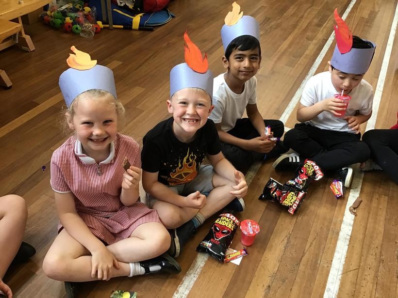 We started off with a worship with Reverend Rebecca. We have learnt the importance of Pentecost by reading the story. We have also made our own kites and flame hat. Along with Almond and Elm, we have created a large piece of artwork to remember the day. We ended the day by having a party to celebrate the birthday of “Christianity”.