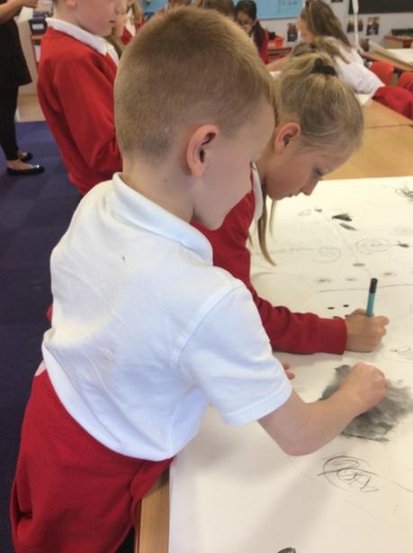 They experimented with all the mark-making tools we could find: 6B, 2B, graphite stick, biro, black felt pen, charcoal, chalk. They layered and experimented all these together and couldn't stop drawing.