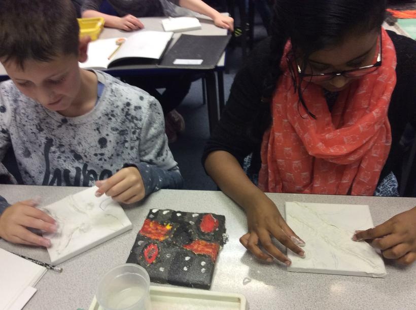 First, in our sketchbooks, we made preparatory sketches and paintings of lava flow and shapes. We noticed the textures of molten and cooled lava. We decided to use mod-roc to create these textures and then painted our relief canvases when dry.
