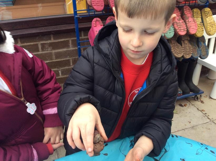 EYFS have began their journey into clay - making clay conker shells to hold a conker.